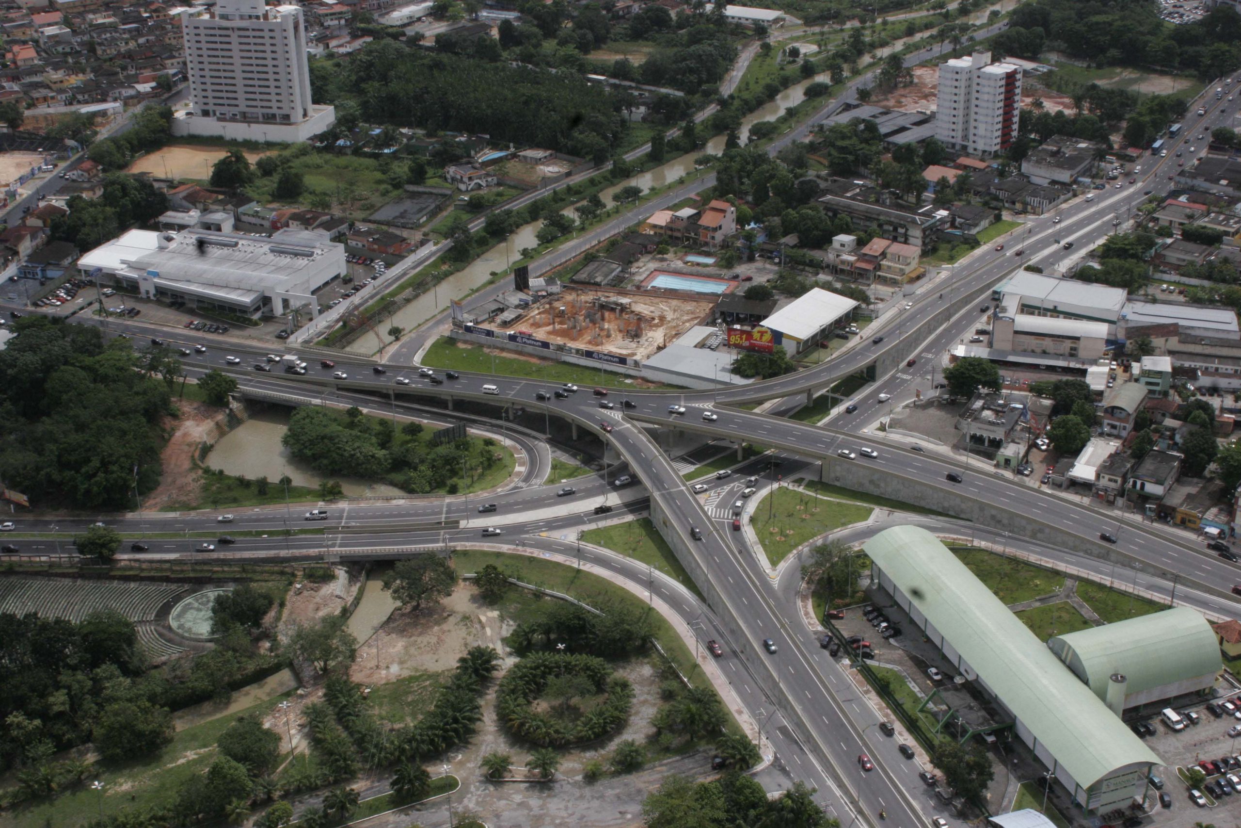 Vista das Pontes sobre o Igarapé do Mindu. Abaixo, trecho da avenida Jornalista Umberto Calderaro Filho, onde se vê a terceira ponte.